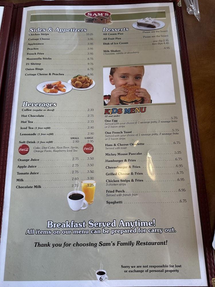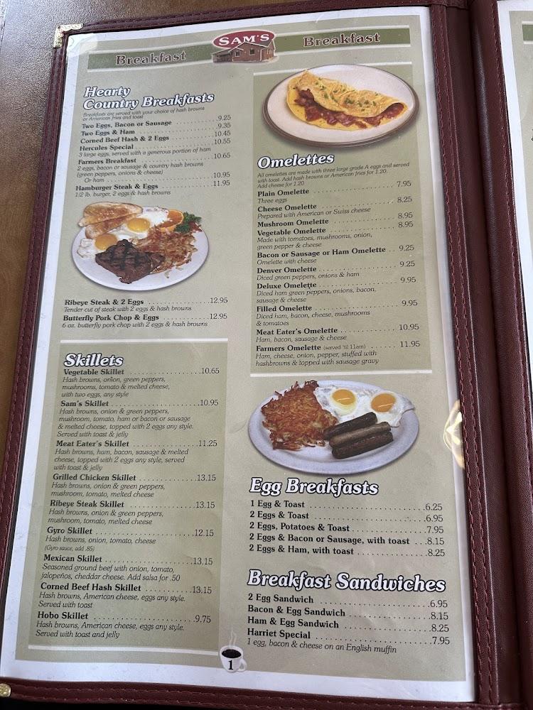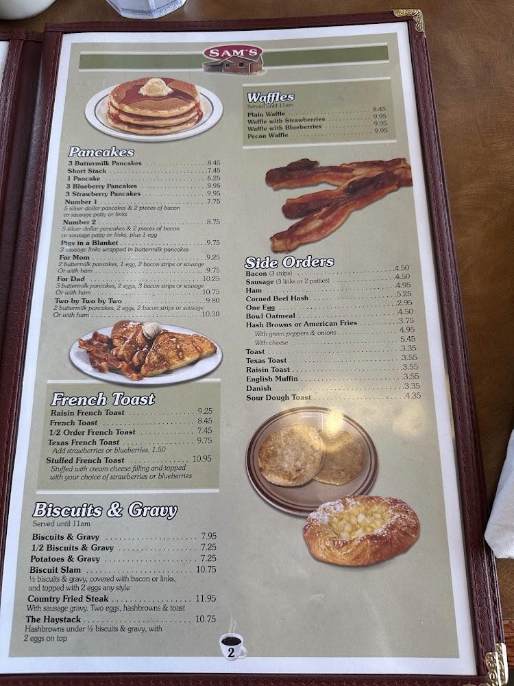 Sam's menu features a range of classic diner favorites. From breakfast staples like fluffy pancakes to hearty lunch sandwiches, there's something for everyone. Most customers love the extensive breakfast selection that includes omelets, biscuits, and homemade soups.